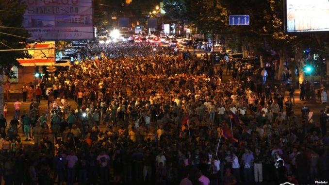 The protesters marched from a street section in Erebuni to the city center and then walked back to that location, chanting թ§Չ-ժSerzhik, go away!թ§Չ-Թ and թ§Չ-ժSasna Tsrer!թ§Չ-Թ — the name of the armed group linked with Founding Parliament.