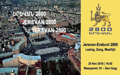 Celebration of 2800th anniversary of Yerevan-Erebuni. After the welcome speech of H.E. Mr. Tigran Balayan, ambassador of Armenia to the Kingdom of Netherlands, the archaeologist Drs. Yannick Raczynski-Henk will give a presentation on Yerevan’s history. Thereafter, the youth choir of Abovian Association under the direction of Ms. Svetlana Aghadjanyan will perform songs about Yerevan-Erebuni. The celebration will continue with Armenian meal, music and dance.